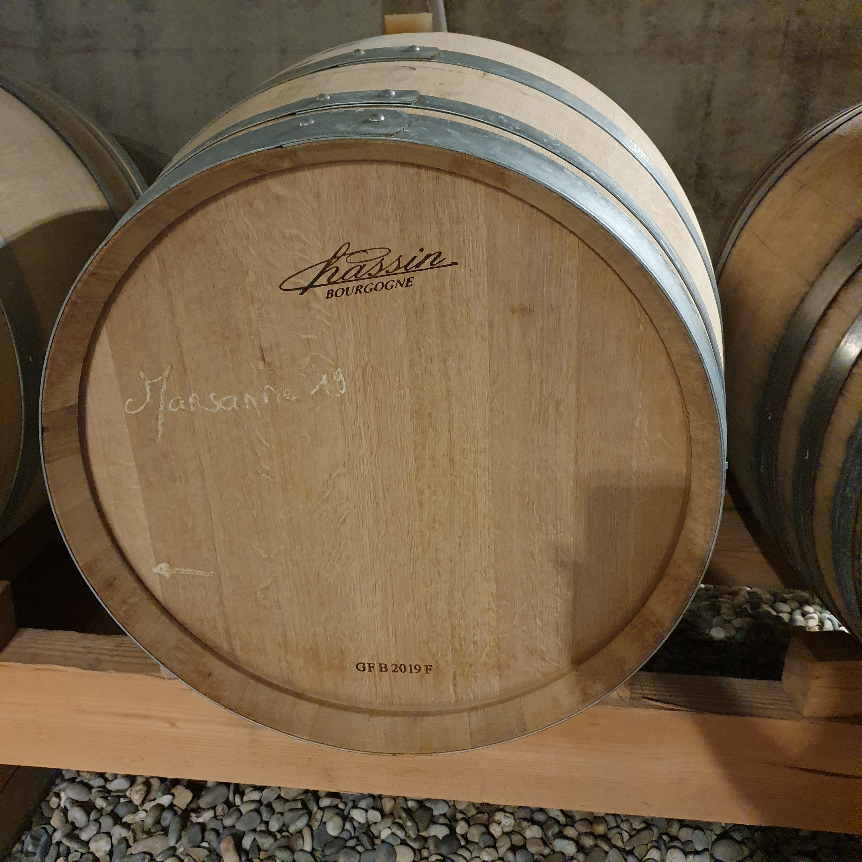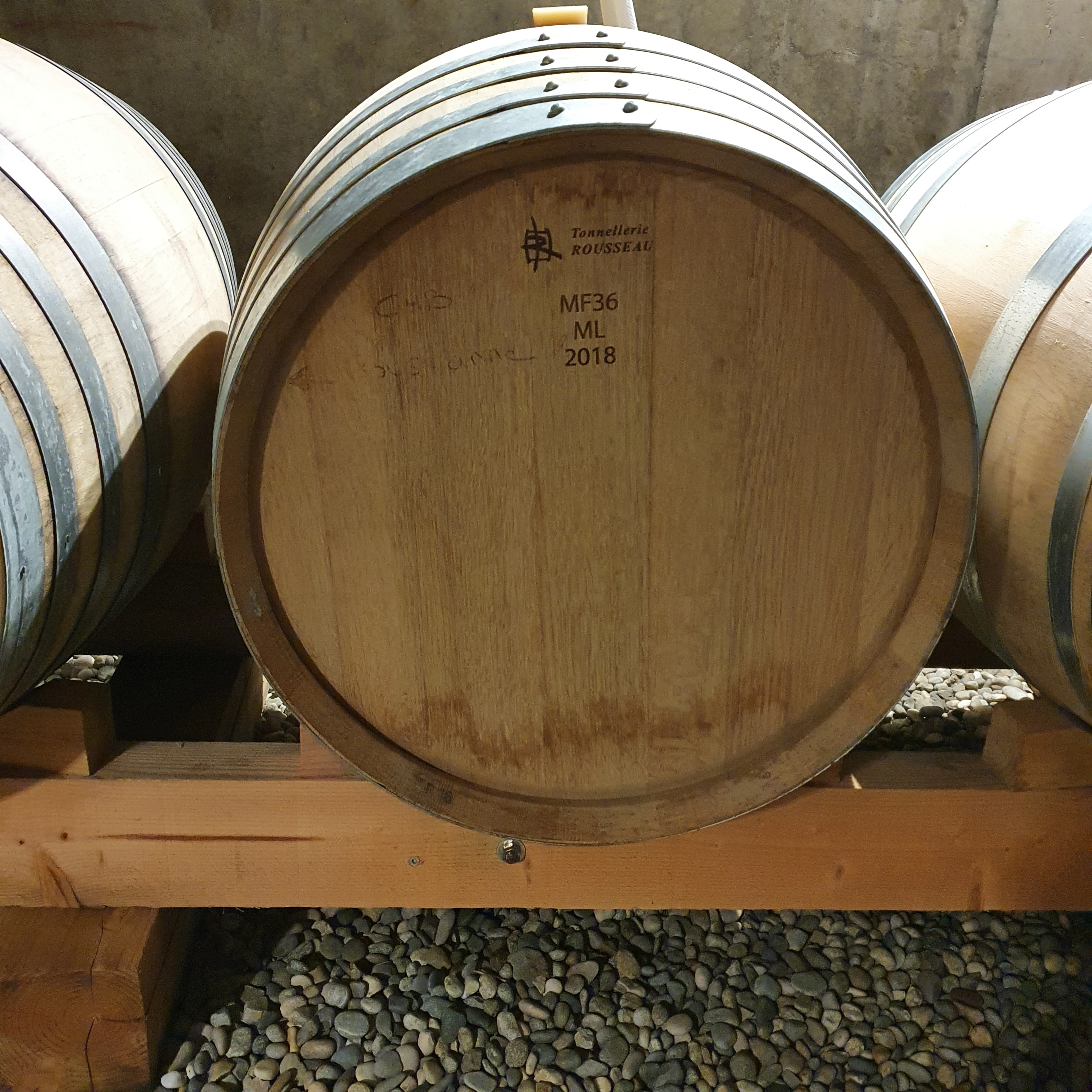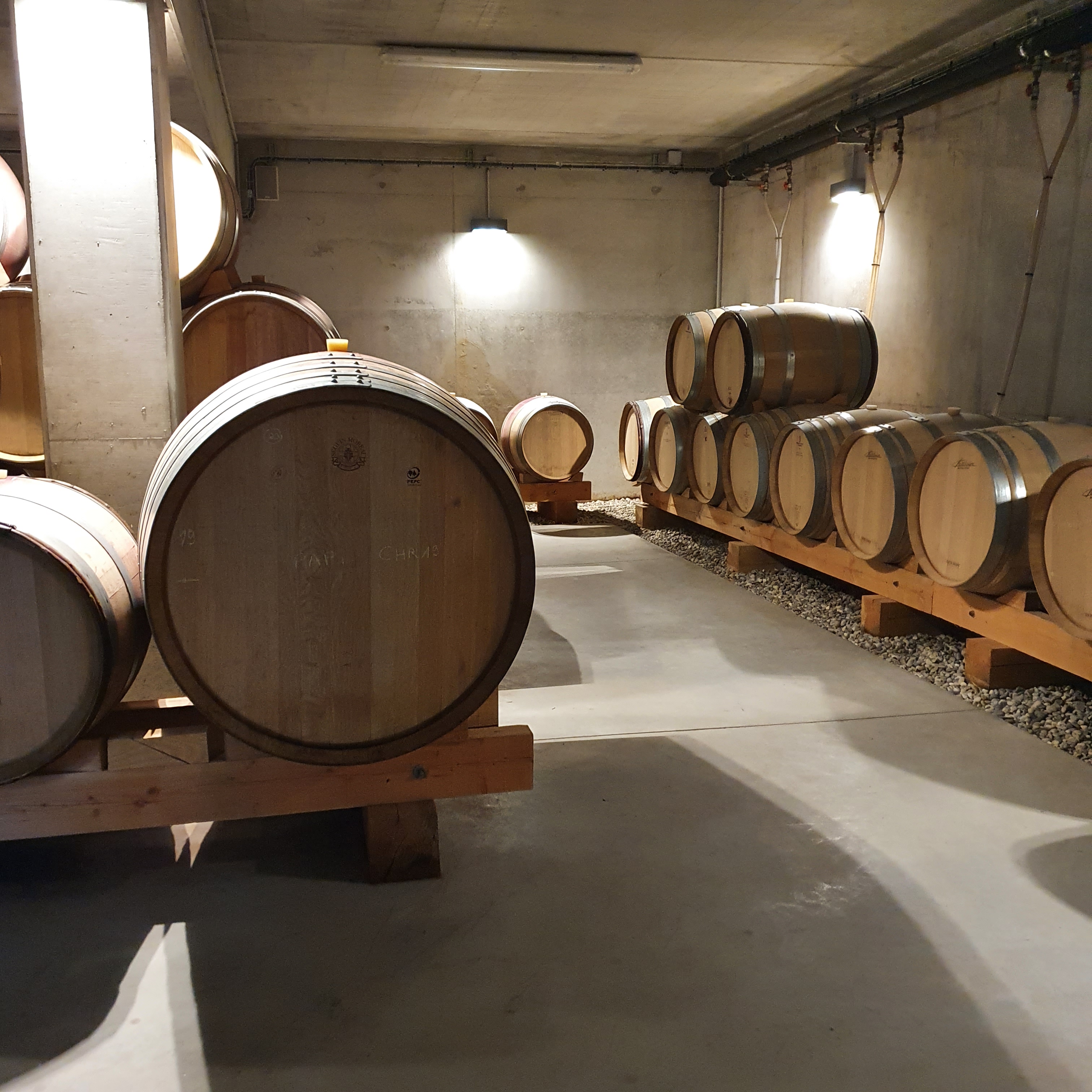Nous descendons dans le chai à barriques où les fûts sont posés sur des pierres afin de retenir l’humidité.